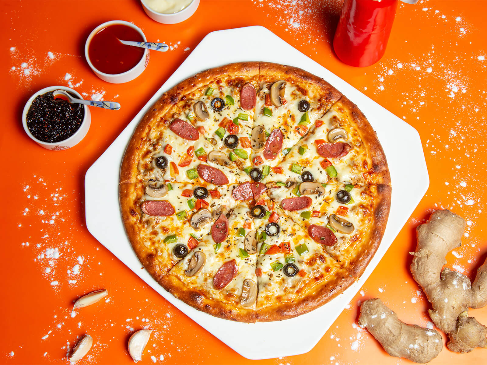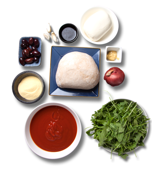 pepperoni, biff, kylling, soltørkede, mais, løk (M,HV,E)